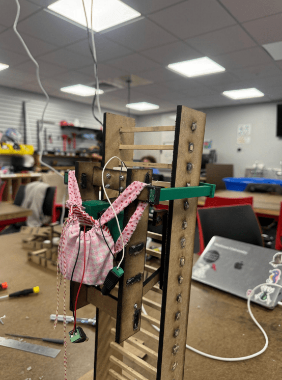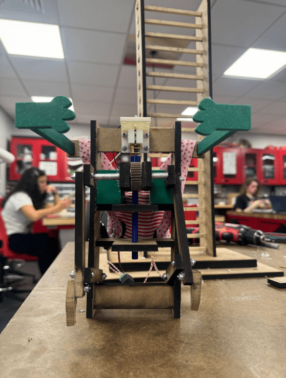 For my final project, I worked with a team to designed and build a biologically inspired climbing robot modeled after the human form. Our climber used a mechanical system powered by a motor and worm gear to extend and contract its legs and move vertically. We assembling the design in OnShape, laser cut the key components, sewed a custom backpack to house the electronics, and building the ladder base for testing. The project involved prototyping, 3D printing, and troubleshooting challenges with motion, weight, and materials, ultimately leading to a functioning climber and a deeper understanding of engineering design.